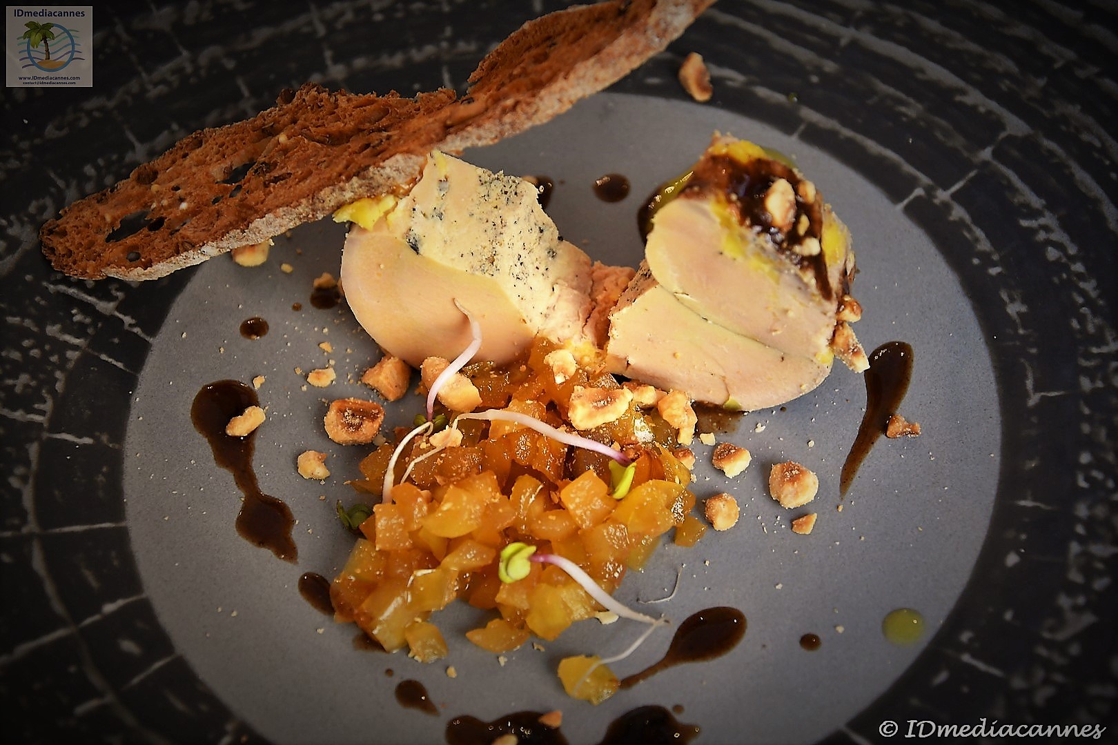 Foie Gras Ferme du Puntoun, chutney de pommes caramélisées à la vanille Bourbon, brisure noix de cajou