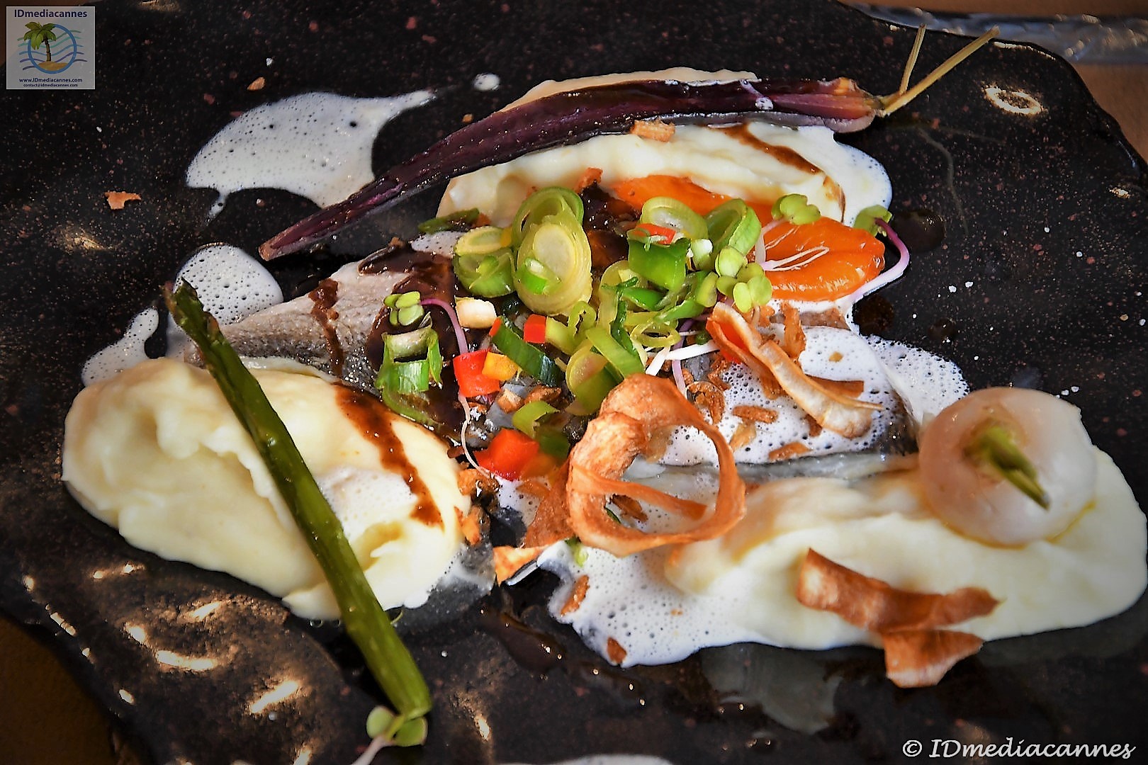 Pêche du jour et écume de citrons, mousseline de panais aux zestes de citrons de Menton, chips de panais et petits légumes du maraîcher