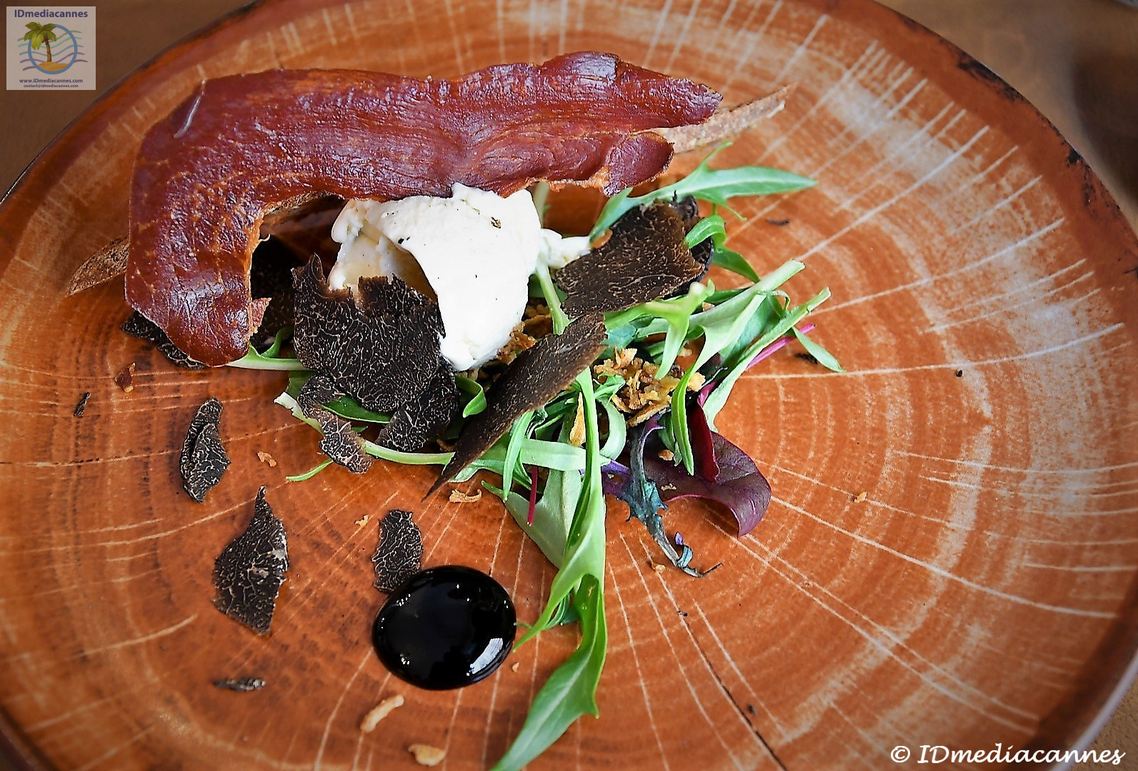 Glace Brie de Meaux à la truffe, tuile de Jambon Sérrano et réduction de vinaigre balsamique