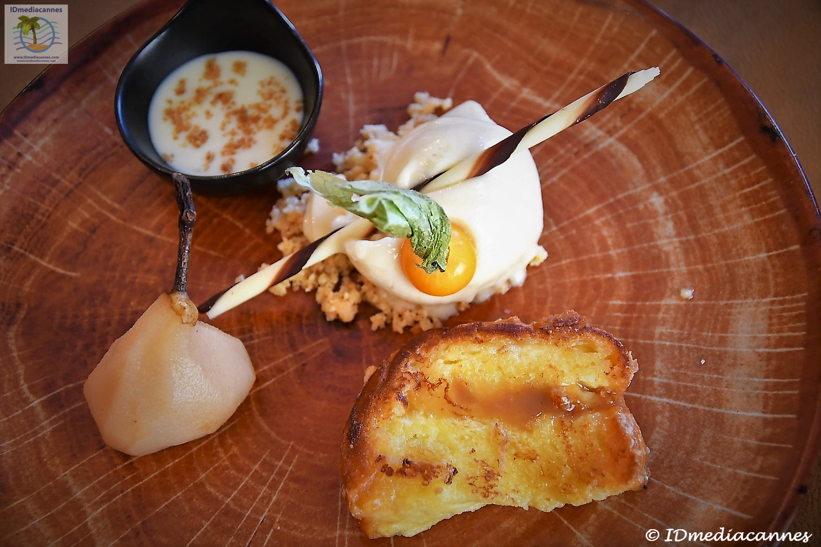 Brioche façon pain perdu, poire pochée, sorbet poire et sauce chocolat blanc, whisky
